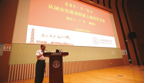 9月30日下午,在喜迎建国七十一周年之际,在这个上海科技大学成立满七年的日子里,上海科技大学报告厅里举办了一场特别的“四史”教育暨学改革开放史专场报告会,上海科技大学副校长丁浩作了题为《从城市发展进程看上海改革开放》的主题报告。校党委书记李儒新,校领导朱志远、鲁雄刚、吴强以及各党总支、党支部书记、相关部门负责人与近400名党员师生和入党积极分子共同聆听了报告。报告会由吴强主持。