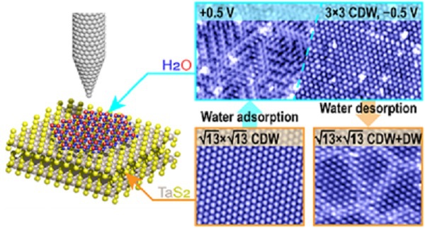 图:低温扫描隧道显微镜观察到的单层水分子膜对1T-TaS2电荷密度波的可逆调控
