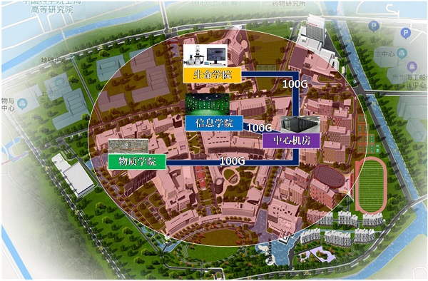 为与时俱进地支撑上述要求,图书信息中心通过整体设计,统筹规划、分步递进地实施了校园骨干网络的改造。经过近期紧张施工,已完成了生命学院、信息学院、物质学院等区域到学校中心机房的骨干网从40G到100G的升级,并且针对部分重点实验室区域实施了10G接入改造,结合硬件存储资源升级而开通了在研科研数据保存服务和终端安全防护软件服务,初步建成了端到端的高速科研网络。