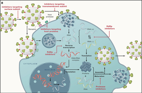 文章首先总结了目前主流抗病毒药物的靶点,包括介导病毒与细胞受体识别的病毒表面蛋白(surface protein, SP)的受体结合亚基、介导膜融合的病毒SP跨膜亚基、细胞上的受体、切割SP所需的宿主细胞蛋白酶、 RNA病毒的基因组复制所必需的RNA依赖的RNA或DNA聚合酶(RdRp和RdDp)以及切割病毒前体蛋白的病毒蛋白酶。
