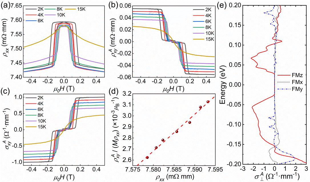 图4(a) – (d):纵向磁阻及横向反常霍尔效应测量及分析结果;(e):计算的三个铁磁磁化方向反常霍尔电导。