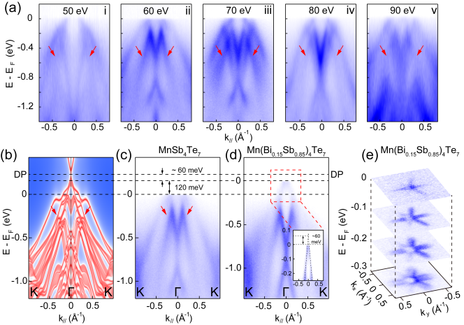 第一,MnSb4Te7在A型反铁磁基态,受时间反演对称及半晶格平移对称性联合保护的轴子绝缘态,亦即Z2反铁磁拓扑绝缘体,具有一个约75 meV的直接带隙(图2a)。该拓扑态为验证MnBi2Te4中轴子绝缘态所表现出的拓扑磁电效应提供了一个新的研究平台。