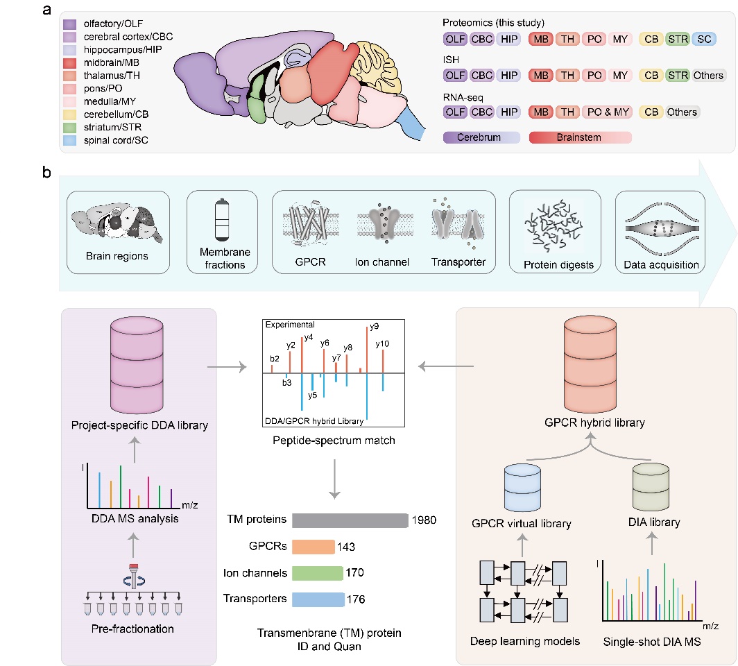 大脑是生物体内结构和功能最复杂的组织。近年来蓬勃发展的脑蛋白组学研究是绘制大脑功能分子图谱、全面理解大脑生理病理机制的必经途径。以G蛋白偶联受体、离子通道和转运体为代表的跨膜蛋白家族在突触信号传递和神经可塑性调节中扮演重要角色,许多跨膜蛋白与精神类疾病和神经退行性疾病的发生发展密切相关。虽然功能上极其重要,但对动物组织中跨膜蛋白家族的组学解析至今仍面临巨大的技术挑战,急需发展更高效、更灵敏、选择性高且可精准定量的新组学技术。