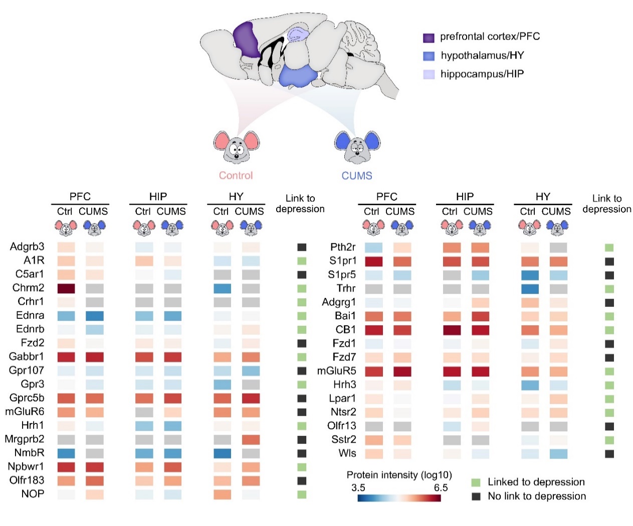 研究人员进一步利用组学新技术来研究多重慢性压力诱导的抑郁模型(CUMS)中多脑区跨膜蛋白组的全局调控。通过体内药理学实验,研究人员发现两种GPCR蛋白的调节剂能够特异性得缓解小鼠的多种抑郁样表型。该研究建立的脑蛋白质组学研究策略和丰富的跨膜蛋白质数据资源,加深了人们对大脑中跨膜蛋白质空间分布与动态调控的理解,也为抗抑郁药物研发提供了新靶点和新思路。