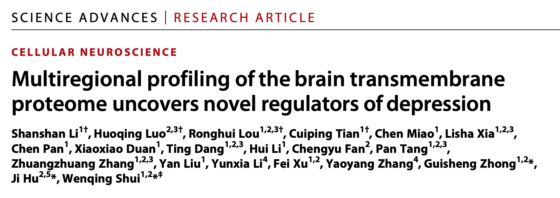 上海科技大学iHuman研究所水雯箐课题组长期发展生物质谱技术,应用于G蛋白偶联受体(GPCR)的配体筛选与功能蛋白质组学研究,促进新结构、新活性的GPCR配体发现与新药靶的挖掘。近日,水雯箐课题组与上科大胡霁课题组、钟桂生课题组合作,系统性绘制小鼠多脑区跨膜蛋白质组图谱,通过对疾病动物模型的脑蛋白质组学研究揭示出两种抑郁样行为的GPCR类新调控因子,为抗抑郁药物研发提供潜在新靶点。该成果于7月21日在学术期刊Science Advances上发表,论文题为“Multiregional profiling of the brain transmembrane proteome uncovers novel regulators of depression”。
