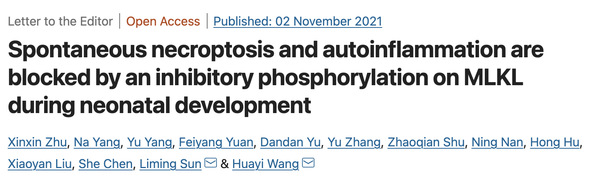 11月2日,上海科技大学生命科学与技术学院王华翌课题组和中国科学院分子细胞科学卓越创新中心孙丽明课题组合作在Cell Research期刊在线发表题为“Spontaneous necroptosis and autoinflammation are blocked by an inhibitory phosphorylation on MLKL during neonatal development”的论文,首次发现程序性细胞坏死(Necroptosis)的执行蛋白MLKL存在一个物种间保守的抑制性磷酸化修饰,通过阻断MLKL的膜转运而抑制细胞坏死的发生;其作为程序性细胞坏死在执行膜裂解之前的重要检查点(checkpoint),保护机体出生后免受过度的细胞坏死造成的炎性损伤而发挥重要的作用。