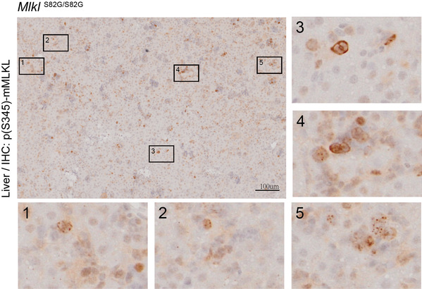 图. MLKL抑制性磷酸化功能缺失突变(MlklS82G/S82G)小鼠肝脏发生程序性细胞坏死。免疫组化显示肝细胞膜上出现被RIP3激活的MLKL(pS345)信号。