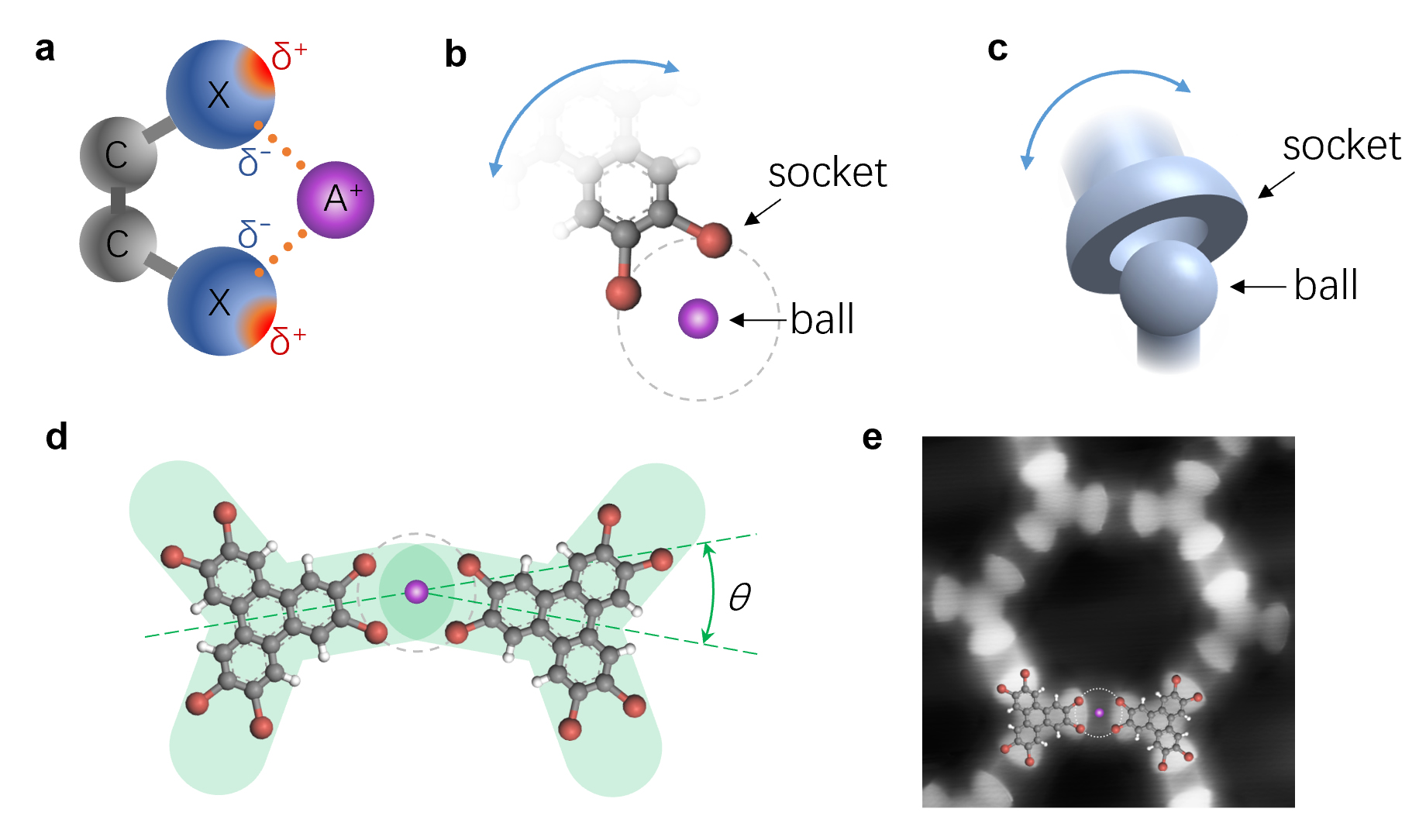 (a-c)邻二卤基团和碱金属离子通过碱卤键构成螯合结构。(b-c)HBT分子中一个邻二溴基团和钠离子构成类似人体肩关节的可活动的分子“关节”。(d)两个HBT分子和一个钠离子构成配位数为2且具有大幅度柔性的金属节点。(e)吸附CO分子的高分辨STM图像可以精确确定分子的相对偏转角度。