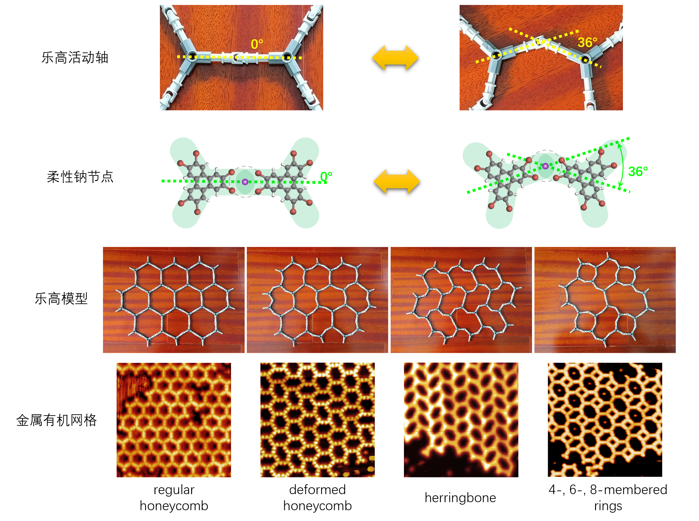 基于柔性碱卤节点构造出的二维MOF网格结构。其柔性和可调性可以通过乐高玩具的十字轴和万向节来模拟