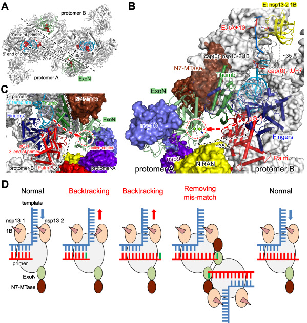 不断出现的新冠病毒突变株对当前已有的疫苗、中和抗体等抗病毒手段提出严峻挑战,亟需发展能有效应对各型突变株的广谱药物。在生命周期中,病毒的一系列转录复制酶组装成“转录复制复合体”超分子机器,负责病毒转录复制的全过程,且在各型突变株中高度保守,是开发广谱抗病毒药物的核心靶点。娄智勇、饶子和、高岩等发现并重构了病毒“加帽中间态复合体”、“mRNA加帽复合体”和“错配校正复合体”,并阐明其工作机制。揭示了新冠病毒转录复制机器的完整组成形式;发现病毒聚合酶的核苷转移酶结构域是催化mRNA“加帽”成熟的关键酶,明确了帽结构的合成过程,为发展新型、安全的广谱抗病毒药物提供了全新靶点;发现病毒以“反式回溯”的方式对错配碱基和抗病毒药物进行“剔除”,阐明了瑞德西韦等药物效果不良的分子机制,为优化针对聚合酶的抗病毒药物提供了关键科学依据。