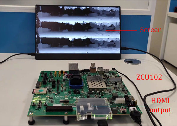 图:高性能、低功耗双目视觉处理器设计:(上) 多尺度计算流程;(中)硬件系统设计框架及数据流;(下)基于FPGA的原型验证系统。