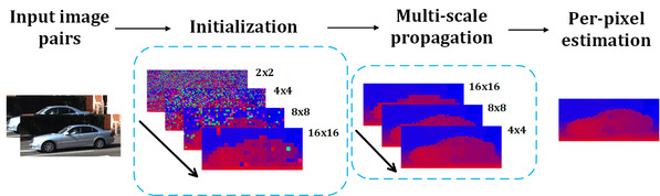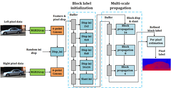 双目视觉作为模仿人眼的深度图像获取方法,被广泛应用于VR、AR、遥感、SLAM以及三维重建之中。与激光雷达等深度获取方案相比,双目视觉系统具有造价低、功耗小以及重量轻等优点。课题组提出的设计以超像素为基本运算单元,引入更接近于真实场景的平面倾斜假设。同时使用随机搜索作为标签更新的策略,通过算法、架构与电路的协同优化,在保持精度的同时,极大地降低了整个系统的运算复杂度。实验结果表明,该成果在处理速度、功耗以及整体能效方面均达到了领域内最高水平。