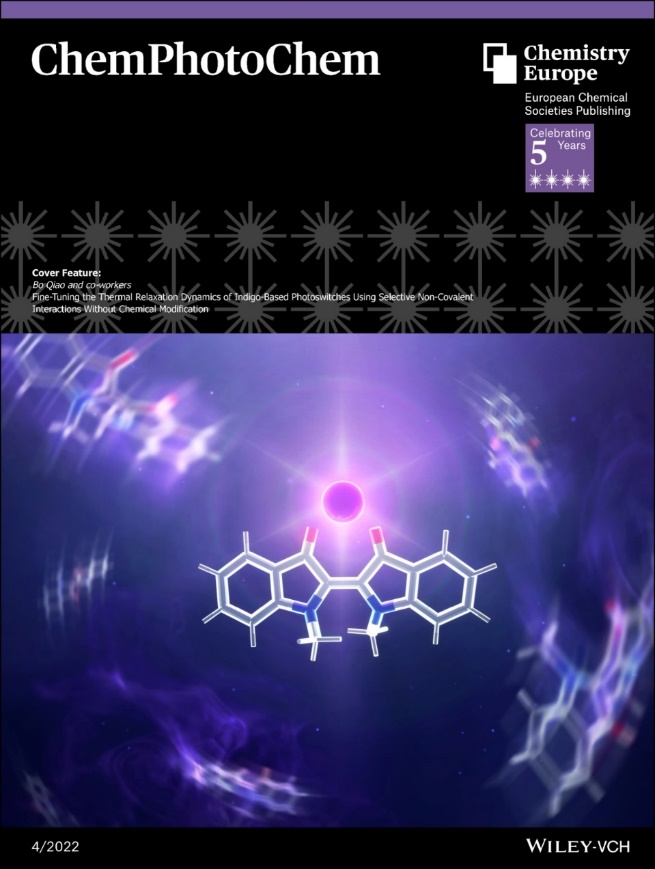 分子光开关是一类可以在光照后改变形状的分子,在光响应材料、离子传输、生物医药等领域具有广泛应用。分子光开关改变形状的快慢(热弛豫速率)是决定其应用场景的一项重要参数,因此这一性能的调控对分子光开关的应用具有重要意义。近期,物质学院乔博课题组报道了一种不通过化学修饰,利用非共价相互作用,直接对靛蓝类分子光开关的热弛豫速率进行调控的方法,该成果发表在光化学领域知名期刊 ChemPhotoChem,并成为当月封面(cover feature)文章。