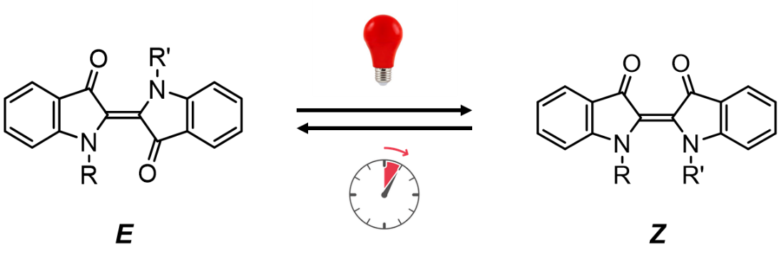 碳碳双键(C=C)广泛存在于各类有机化合物中。当双键的两端带有不同取代基团时,可以形成两种不同的立体异构体(E与Z,如图1)。多数情况下,只有一种异构体是稳定的,而另一种异构体则处于“介稳态”。处于稳态的异构体,只有在受到特定波长的光照激发后,才可以暂时性地转化为介稳态异构体。分子光开关就是利用这一原理,实现在两种不同状态间切换的一种“分子机器”。