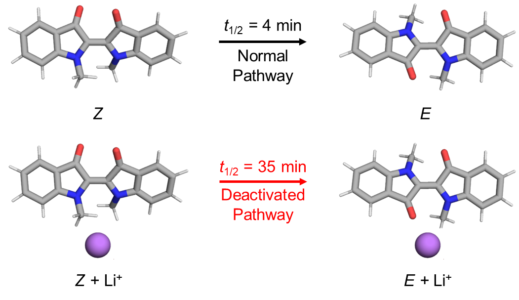 近日,物质学院乔博课题组发展了一种在不依赖化学修饰的前提下,对分子光开关的热弛豫时间进行精细调控的方法。课题组的研究生沈振楠发现,向靛蓝分子光开关的溶液中加入金属阳离子(Li+、Na+等),可以减慢Z状态的分子转变回E状态的速率,将靛蓝分子的热弛豫时间从约4分钟延长至半小时左右(图3)。沈振楠还发现,通过改变加入金属阳离子的浓度,可以在这一范围内精确调节光开关的热弛豫时间。