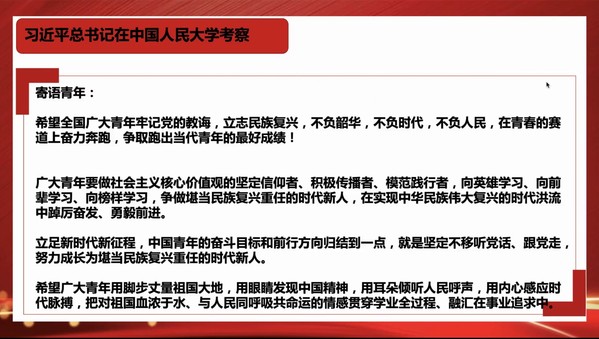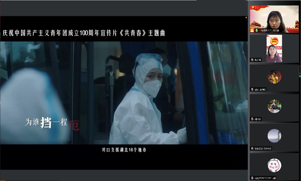 校团委董之瑶做《关于党领导下中国青年运动的百年历程》的报告。校团委学生副书记陈奕璇带领全体团员同学重温入团誓词。熟悉又庄严的誓词提醒着每一位团员青年:铭记团员使命,不忘入团初心。这也激发了每位学生作为一名共青团员的光荣感和责任感。每一位参加宣誓的团员在这庄严神圣的氛围中,接受了一次思想的洗礼和心灵的震撼。