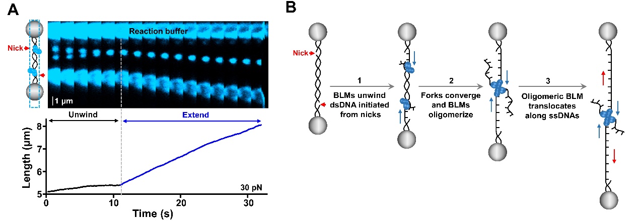 图:A BLM从两个nick处起始对向双链DNA解旋并在聚合后实现单链DNA滑动;B BLM解旋酶的活性转换模型。