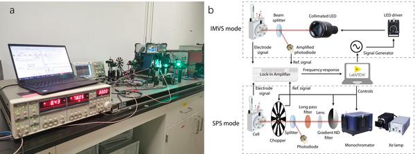 图2:电容式表面光电压测试平台(a)实物图与(b)示意图。IMVS:强度调制光电压谱模式(变调制频率);SPS:表面光电压谱模式(变波长)。