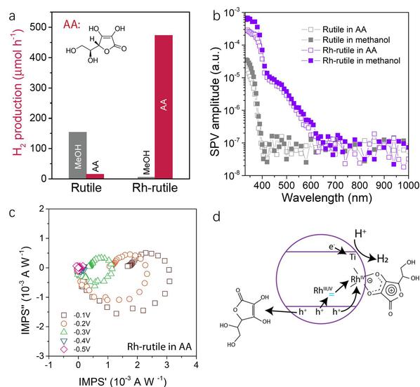 图1:未掺杂和Rh掺杂rutile光催化剂分别在甲醇(MeOH)和抗坏血酸(AA)中的(a)光催化产氢速率比较;(b)原位表面光电压谱。Rh掺杂rutile在抗坏血酸中(c)作为光电极在不同偏压下的强度调制光电流谱;(d)作为颗粒光催化剂的反应机理示意图。