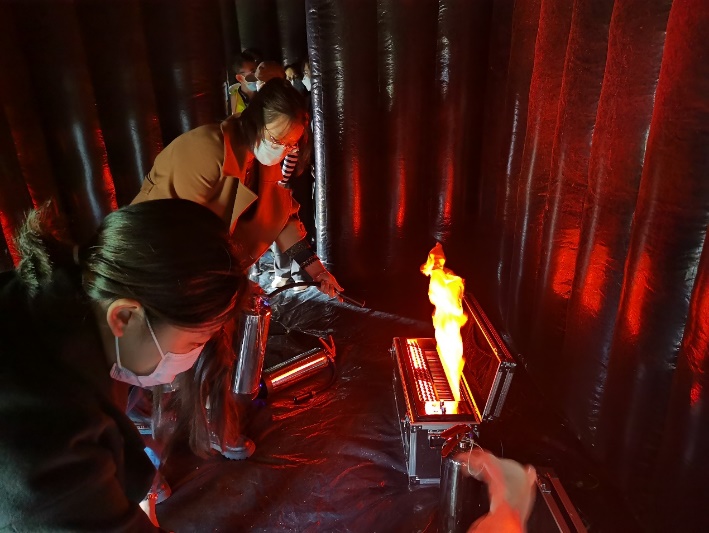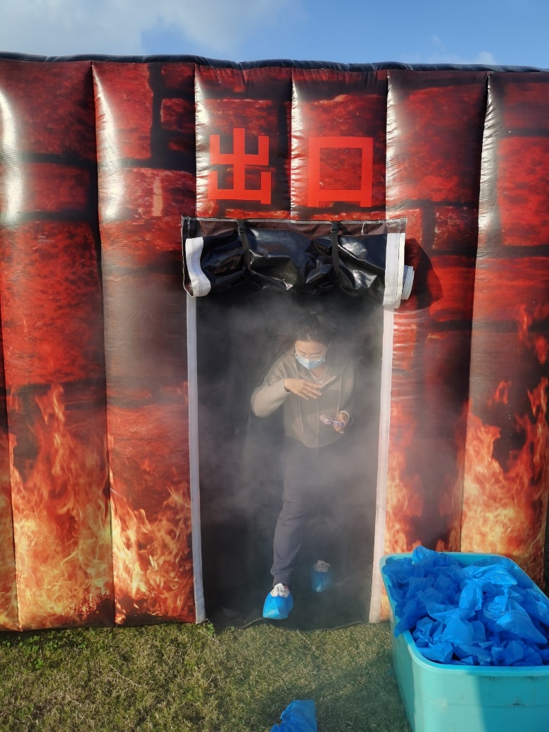 热烟环境逃生系统采用声光电及烟雾的虚拟现实技术,模拟现实火灾发生时走廊、房间内充满烟雾的状态。师生进入到一个烟雾弥漫、无照明的密闭帐篷,需要根据现场安全警示标识,摸索前进,并在过程中运用“捂住口鼻,保持低姿,注意脚下路径,快速有序”的逃生要领,有序撤离。