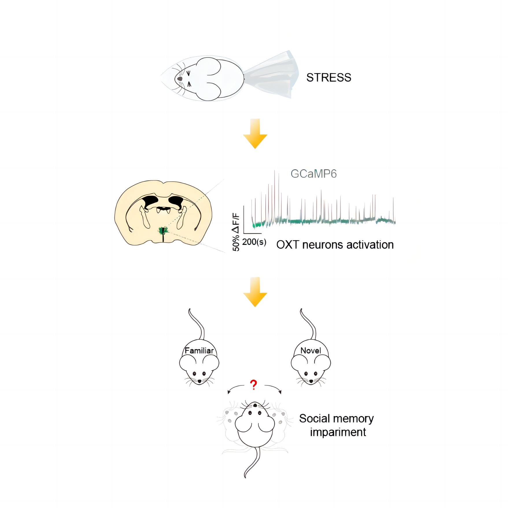 图示:此研究分析了室旁核催产素神经元对多种刺激的反应模式,揭示了催产素神经元在应激调控社交行为中的重要作用,并为理解其生理功能和治疗应用提供了重要线索。