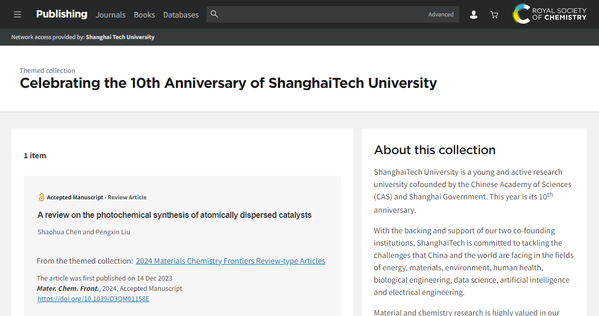 物质学院师生自2023年8月开始筹划、投稿,以科研成果集成专刊祝贺上科大建校十周年。经过层层审稿和同行评议后,12月底正式上线第一篇论文。其他十数篇相关文章将在专刊陆续发表。