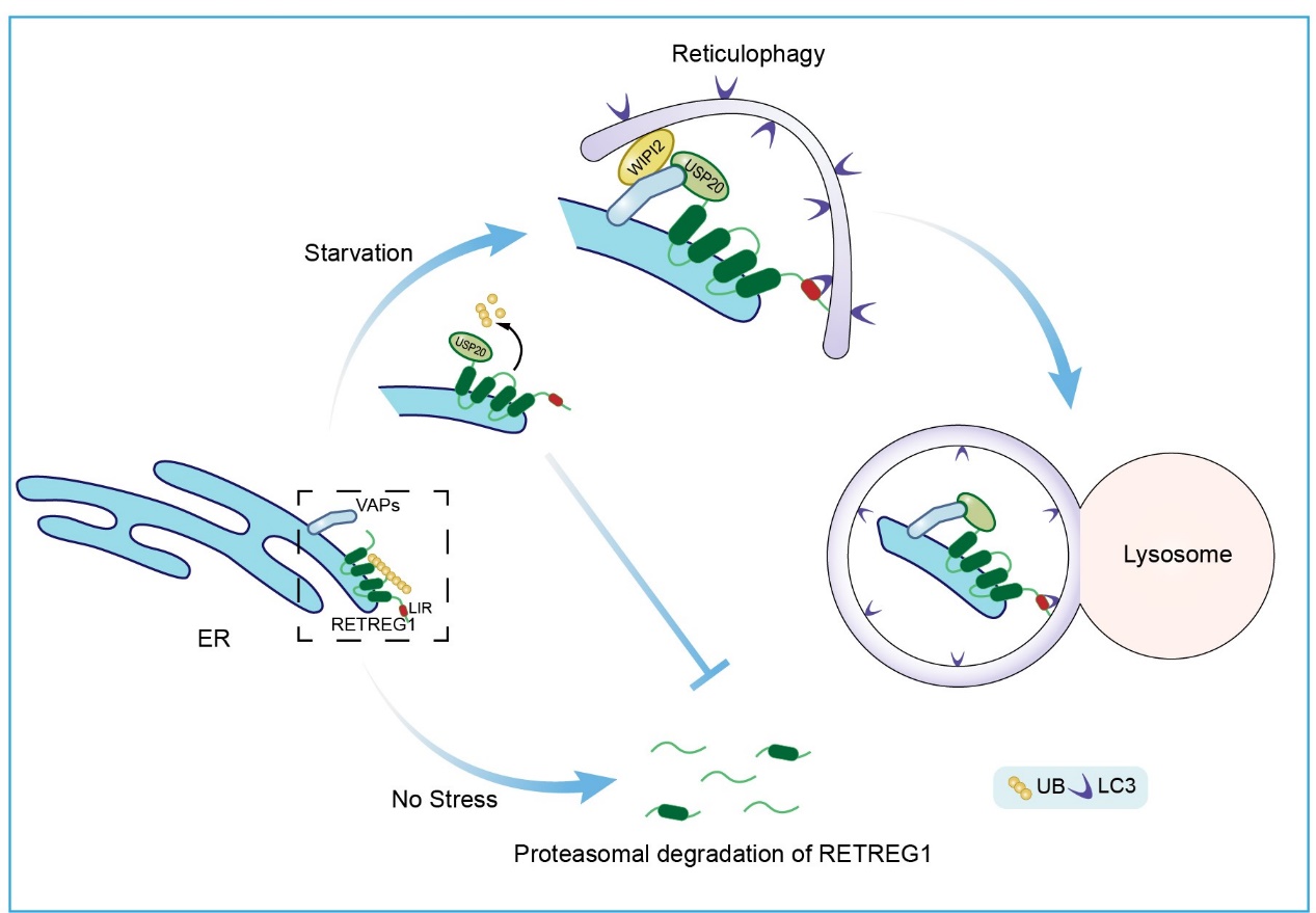 作为细胞质蛋白质,USP20通过FFAT基序与内质网膜蛋白VAPA/B的MSP结构域相互作用,定位于内质网。研究者进一步探究了USP20对内质网自噬的调控作用,发现USP20通过调控内质网自噬受体RETREG1的去泛素化来稳定其不被泛素-蛋白酶体途径降解。USP20与RETREG1在内质网上并非均匀分布,两者在特定区域呈现一定的共定位,而饥饿条件则增强这种共定位的比例。