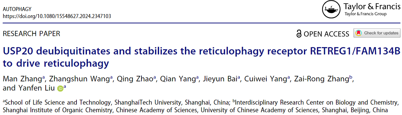 5月12日,上海科技大学生命科学与技术学院刘艳芬课题组在学术期刊Autophagy(《自噬》)上在线发表了题为“USP20 deubiquitinates and stabilizes the reticulophagy receptor RETREG1/FAM134B to drive reticulophagy”的研究论文,阐明泛素化修饰在内质网选择性自噬降解中的调控机制。