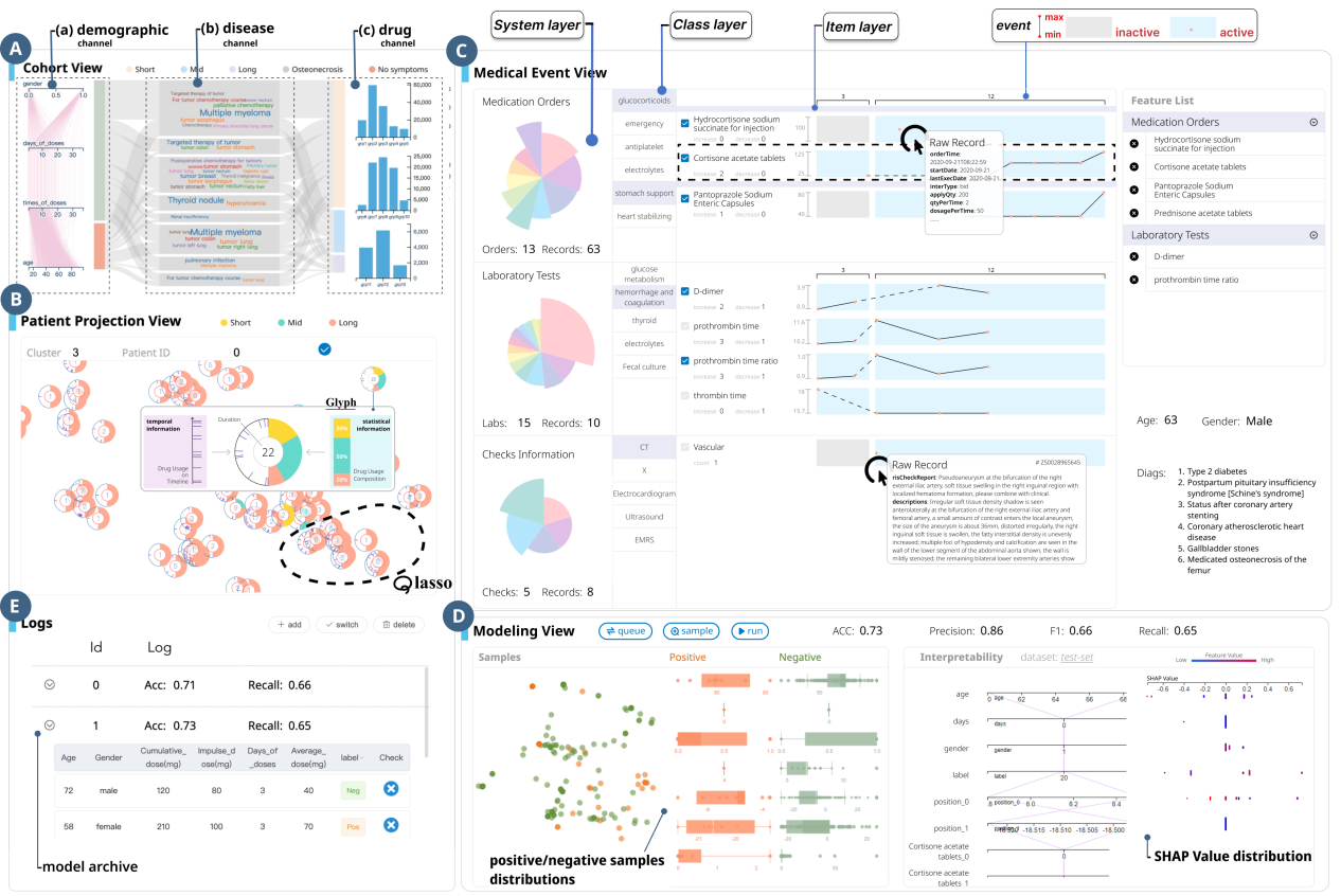 图| 系统概览:阶段I包括(A)队列视图,用于理解药物事件与疾病进展之间的关系,(B)患者投影视图,用于探索特定患者群体的特征,以及(C)医疗事件视图,用于详细可视化患者的医疗事件。阶段II包括(D)建模视图,用于迭代的AI模型开发和性能评估,以及(E)日志视图,用于维护模型及相关数据的迭代记录。