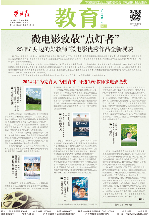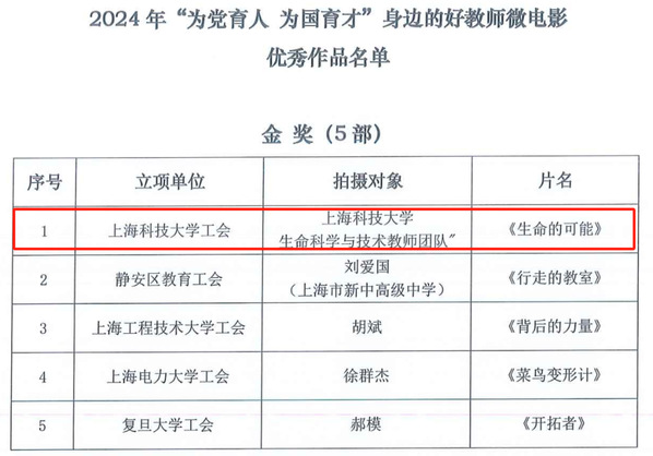 近日,我校工会组织拍摄的微电影作品《生命的可能》获2024年“为党育人 为国育才”身边的好教师微电影金奖,并在上海教育电视台进行展播。