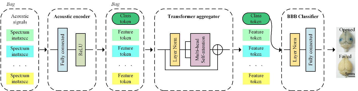 研究人员提出了一种基于Transformer的深度学习预测模型(图2),结合聚焦超声调控血脑屏障通透性过程中的声学反馈信号,实现了对于血脑屏障开放效果的快速准确评估,准确率高达96.7%。