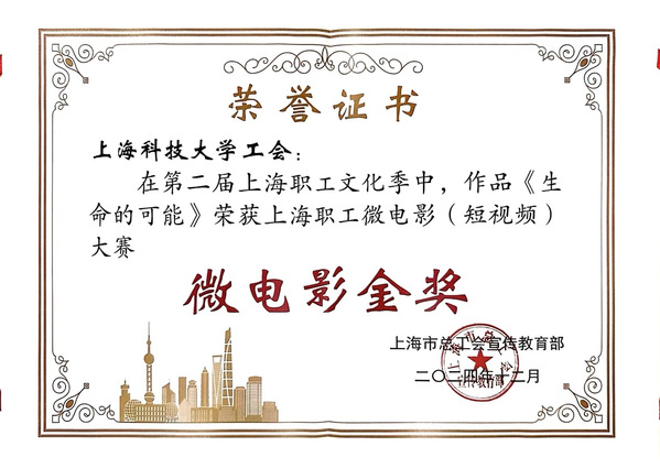 由上海科技大学工会组织拍摄的微电影作品《生命的可能》代表教育工会参加第二届上海职工微电影大赛,荣获金奖。