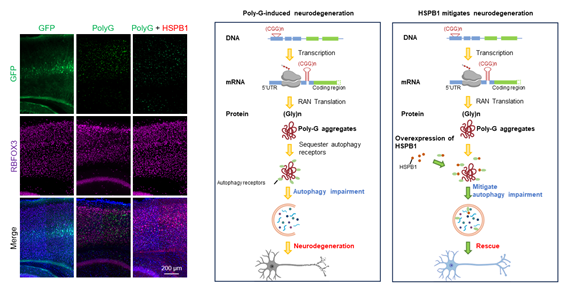 本研究首次揭示了poly-G聚集体通过“劫持”自噬受体 (如SQSTM1/p62) ,干扰细胞自噬通路的激活,导致毒性蛋白清除障碍,最终引发神经元死亡的致病机制。同时,研究者发现细胞内的小分子热休克蛋白HSPB1能够逆转这一过程,为神经退行性疾病的治疗提供了全新思路。