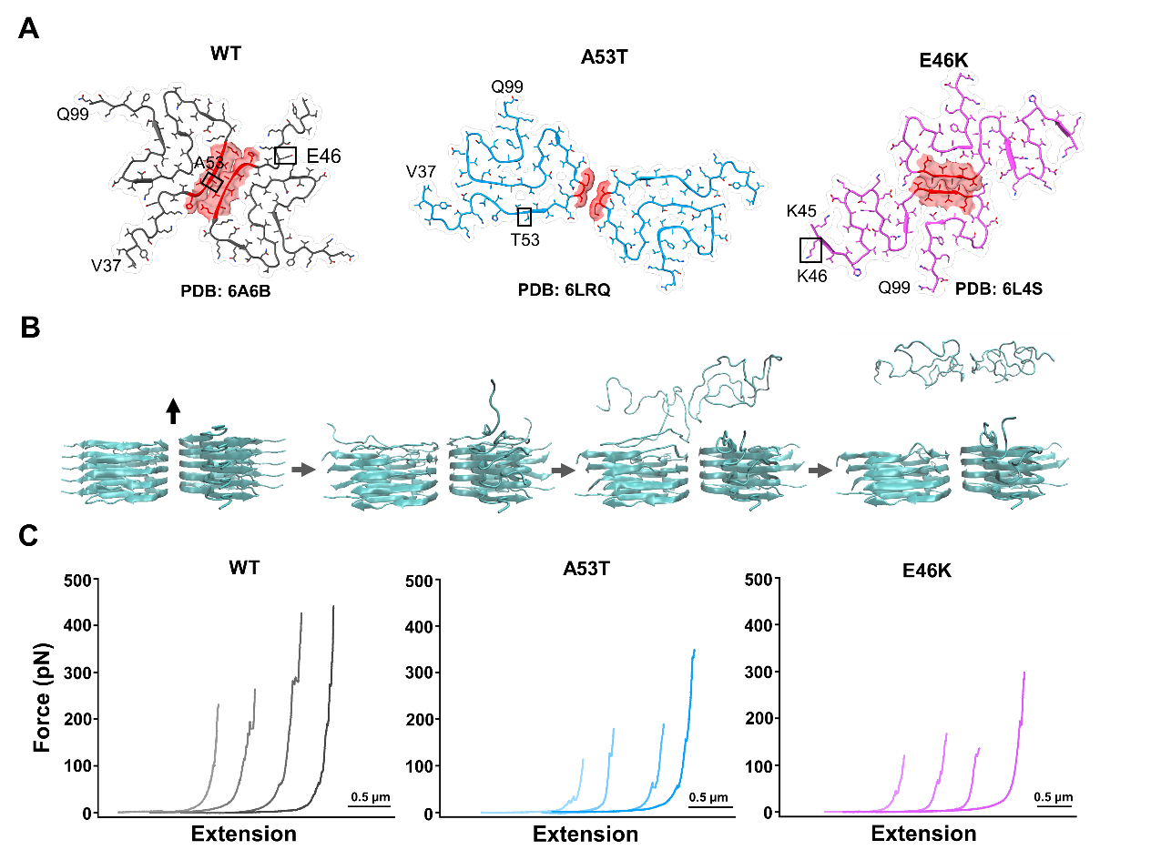 另一项研究进一步利用该单分子方法定量对比了野生型和两种家族性帕金森病致病型突变α-syn原纤维(E46K和A53T)的力学特性(图2)。与野生型α-syn原纤维相比,E46K和A53T突变纤维在轴向破坏应力下表现出更差的稳定性。冷冻电镜结构和分子动力学模拟分析表明纤维中的β-折叠结构以及横向界面在稳定纤维结构中起主导作用。此外,E46K突变纤维由于其灵活的外围结构,更易在发生局部变形。