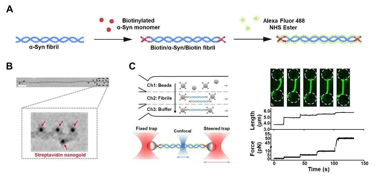 帕金森病和阿尔兹海默病等神经退行性疾病严重威胁人类健康,其核心病理特征之一是淀粉样纤维(amyloid fibrils)的异常聚集,其中最具代表性的蛋白包括α-syn、Tau和Aβ。这些蛋白聚集体不仅作为疾病的病理标志物以多种构象存在,还在神经炎症、细胞损伤及疾病传播过程中发挥关键作用。因此,科学界围绕如何利用化学小分子干预或破坏这些病理淀粉样纤维开展了广泛研究。近年来,冷冻电镜(Cryo-EM)技术的突破显著推动了对这些病理性纤维原子结构的理解,但其通常依赖于对成千上万条病理纤维的静态平均信息。目前,对于单个病理性纤维在溶液中的力学特性及其与化学小分子的相互作用仍知之甚少。