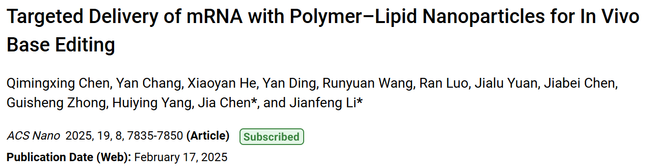 近日,上海科技大学生命科学与技术学院李剑峰课题组和陈佳课题组合作,在国际学术期刊《ACS 纳米》 (ACS Nano)发表了题为“Targeted Delivery of mRNA with Polymer-Lipid Nanoparticles for In Vivo Base Editing”的研究论文,报道了一类新型核酸递送系统聚合物-脂质纳米颗粒(Polymer-lipid nanoparticles, PLNPs),成功将碱基编辑器ABE8e递送至肝脏,实现高效的心血管疾病相关风险基因Pcsk9和Angptl3的碱基编辑和协同降血脂功效,编辑效率处于国际领先水平。