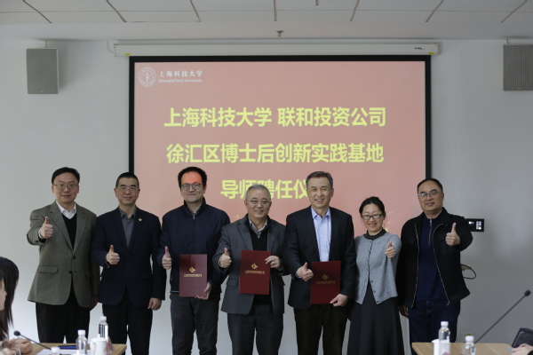 3月21日下午,上海科技大学、上海联和投资有限公司与徐汇区博士后创新实践基地在上海科技大学共同举办联合招收博士后导师聘任仪式。徐汇区人才工作局副局长李俪巧,上海联和投资有限公司党委书记、董事长叶峻,党委委员、副总裁杨勤勇,上海科技大学党委副书记、副校长江舸出席仪式。仪式由上科大人力资源总监周宇主持。
