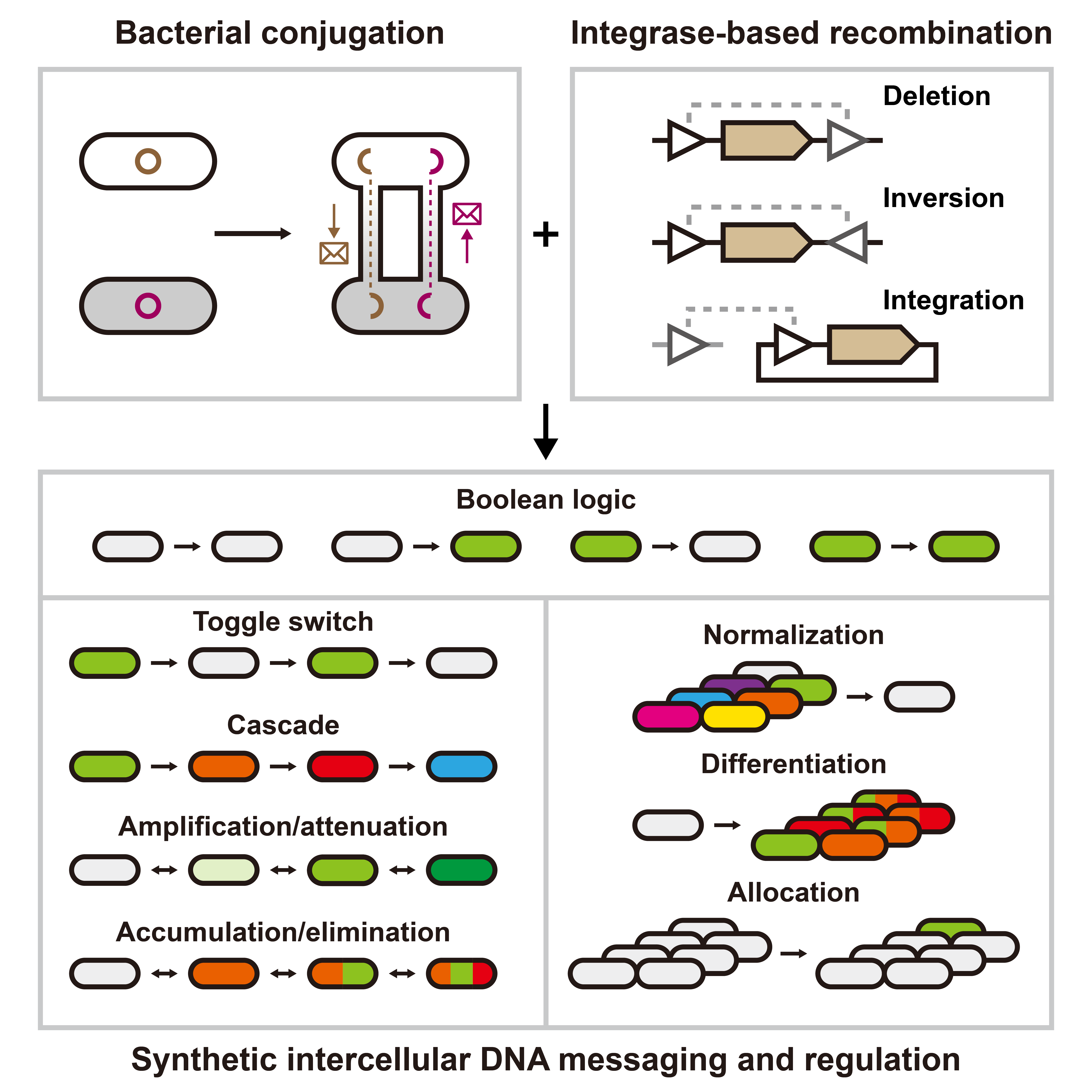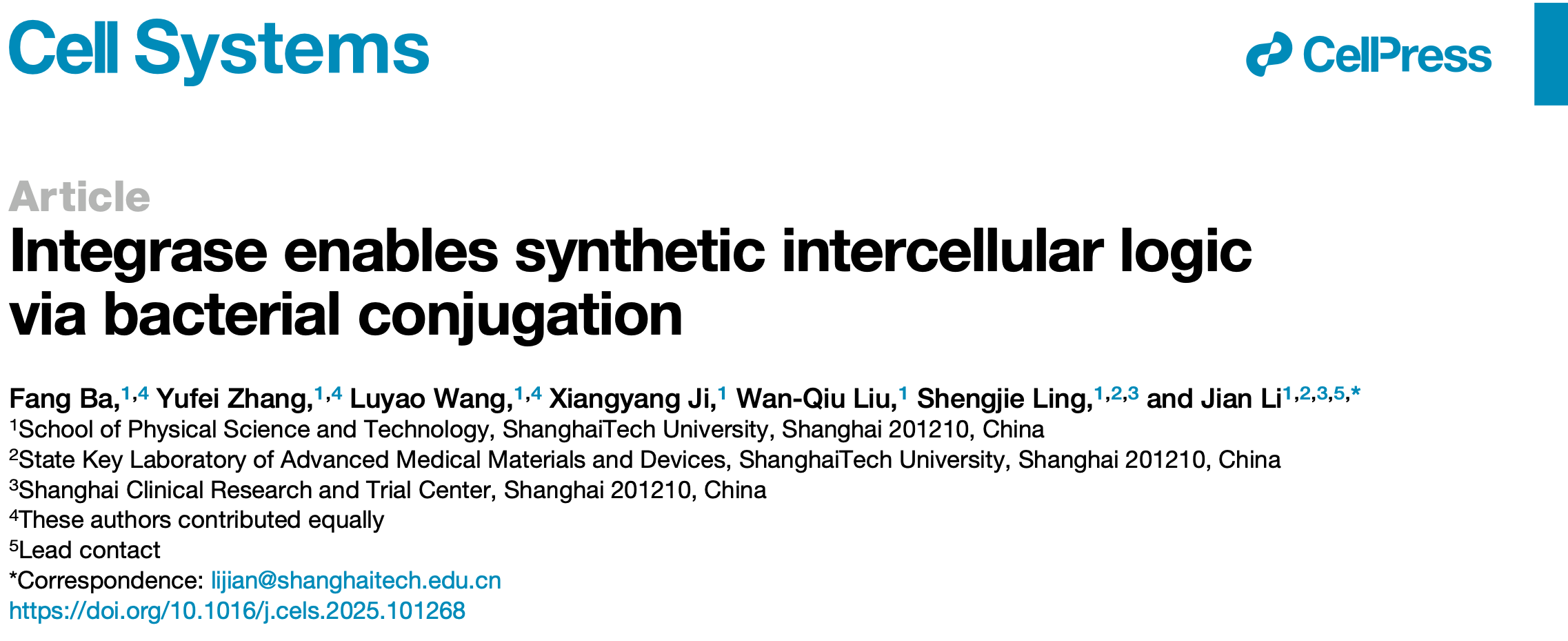 4月28日,上海科技大学物质科学与技术学院李健课题组基于“设计-构建-测试”等合成生物学理念,利用整合酶(integrase)和细菌接合转移(bacterial conjugation)等技术,通过对基因线路的精准调控,在不同大肠杆菌细胞之间实现了胞间信息通讯和逻辑调控,相关成果以“Integrase enables synthetic intercellular logic via bacterial conjugation”为题在线发表于国际学术期刊《细胞系统》(Cell Systems)。