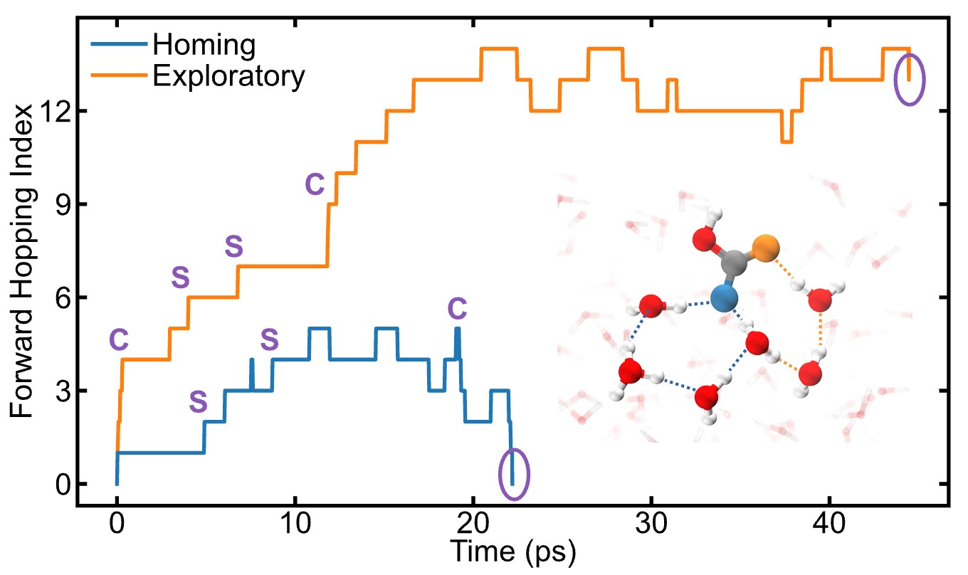 质子传递路径偏好。CT构象解离的质子对于“归巢路径”的倾向性达82.95%,而CC构象质子选择该路径的比例仅为57.76%,这源于CT构象解离的HCO3−中去质子化氧原子与原羰基氧原子对于质子竞争能力的差异更大。
