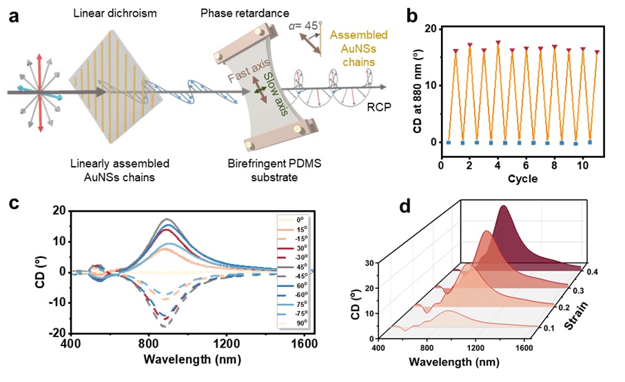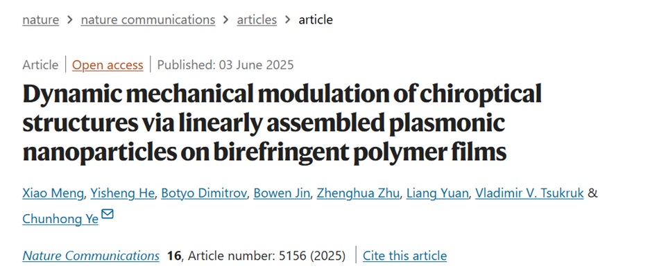 论文标题:Dynamic mechanical modulation of chiroptical structures via linearly assembled plasmonic nanoparticles on birefringent polymer films