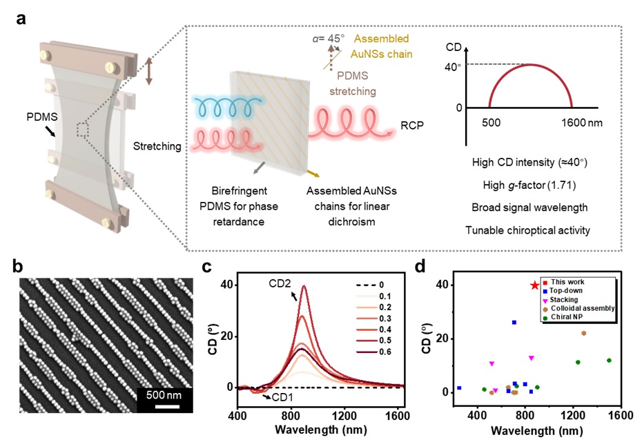 图1. 利用等离子纳米颗粒线性组装结合拉伸的弹性基底构筑手性光学结构