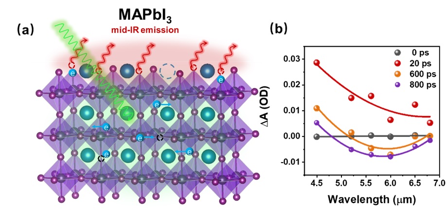 近日,上海科技大学物质科学与技术学院刘伟民课题组通过可见和中红外波段飞秒瞬态吸收光谱,首次在MAPbI3钙钛矿中观测到具有6微米中红外辐射的深层表面缺陷态,为深入理解钙钛矿缺陷态的机制提供了新见解。研究成果发表于国际学术期刊《先进科学》(Advanced Science)。