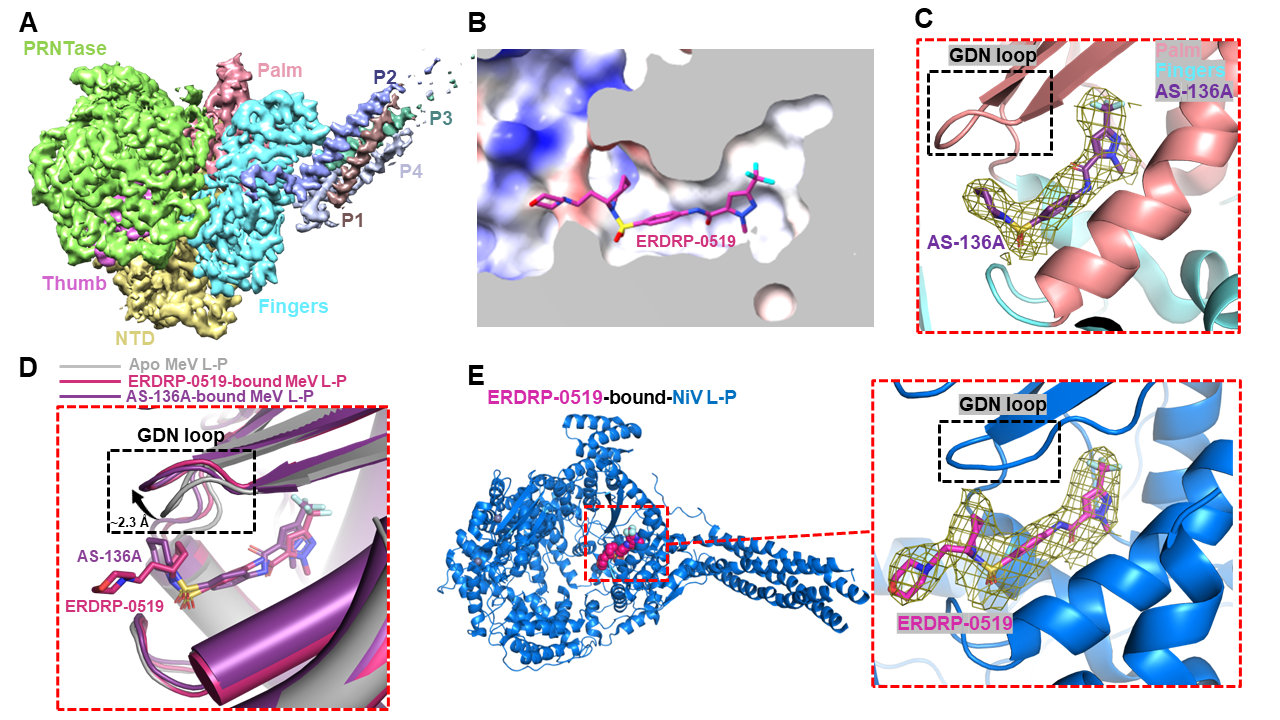 (A) 麻疹病毒L-P复合物冷冻电镜重构图;(B) ERDRP-0519结合麻疹病毒L-P复合物的分子细节;(C) AS-136A结合麻疹病毒L-P复合物的分子细节;(D) 非核苷类抑制剂诱导麻疹病毒聚合酶发生构象变化;(E) ERDRP-0519结合尼帕病毒L-P复合物分子细节