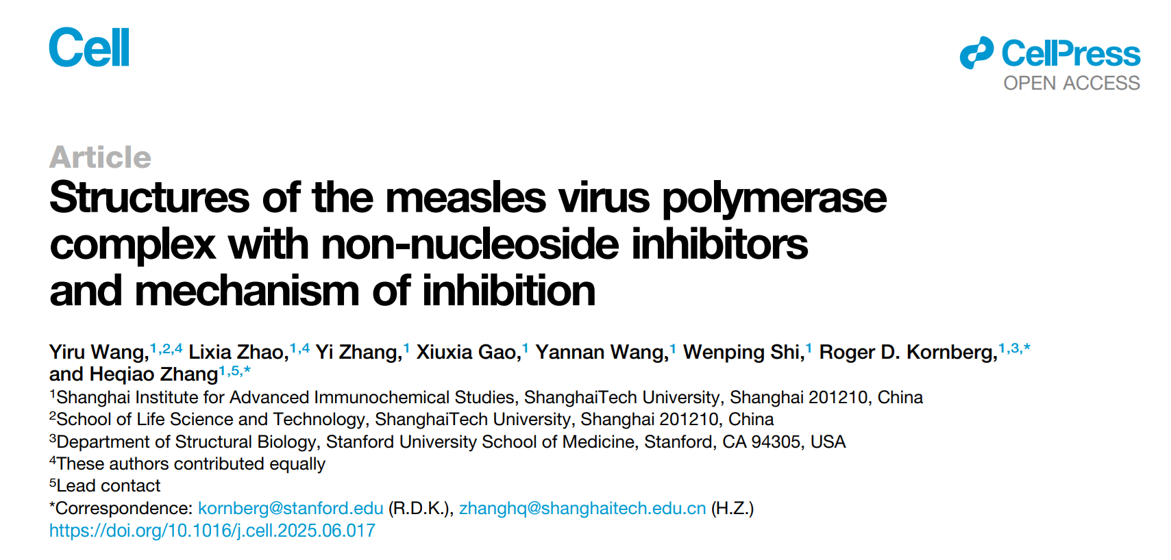 7月7日,上海科技大学免疫化学研究所张贺桥/Roger Kornberg研究团队(结构生物化学课题组)在国际学术期刊《细胞》(Cell)在线发表了题为“Structures of the measles virus polymerase complex with non-nucleoside inhibitors and mechanism of inhibition”的研究论文,报道了非核苷类抑制剂抑制麻疹病毒(Measles virus)和尼帕病毒(Nipah virus)RNA聚合酶复合物活性的分子机制。