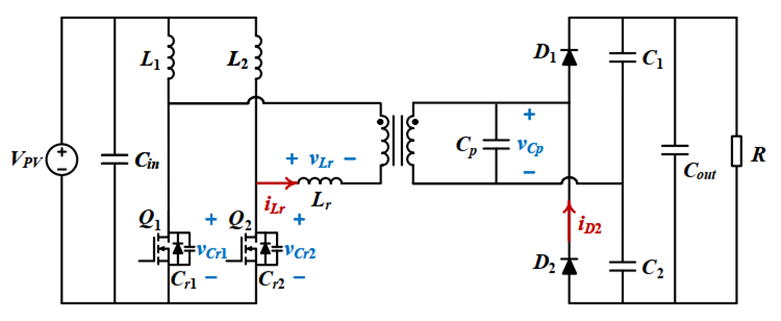 为解决上述问题,上海科技大学信息科学与技术学院智慧电气科学中心王浩宇教授团队提出了一种适用于车顶光伏充电系统的单级高升压比谐振变换器拓扑。该拓扑基于电流型输入结构,采用两相交错工作的准谐振拓扑,实现了纹波电流抑制、谐振软开关和极简器件数量的有机统一。