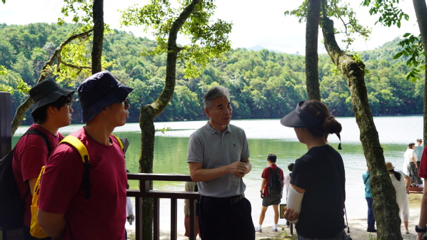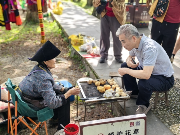 在彝海畔,与当地老人交流