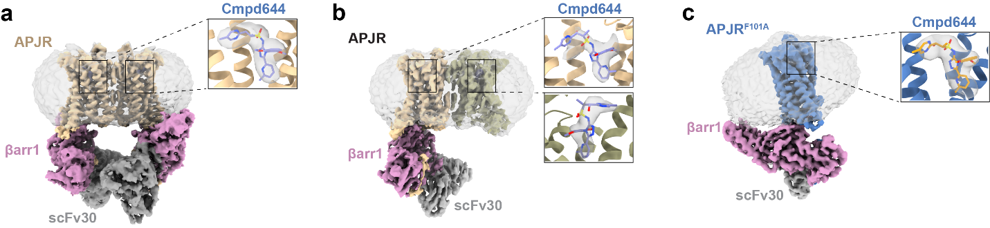 图1:APJR-β-arrestin1复合物结合cmpd644(临床阶段药物的类似物Azelaprag)的冷冻电镜结构。(a)APJR与β-arrestin1结合的2:2化学计量比结构。(b)APJR与 β-arrestin1结合的2:1化学计量比结构。(c)单体突变型APJR(F101A)与β-arrestin1结合的1:1化学计量比结构。