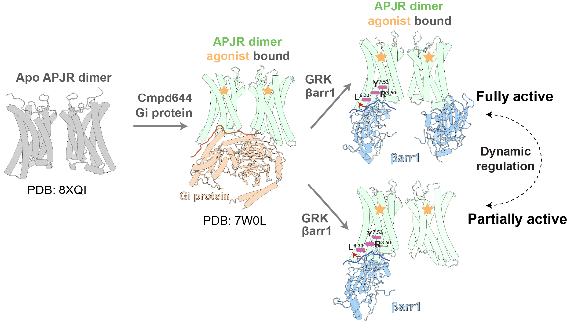 徐菲团队长期深耕APJR研究领域:2017 年率先解析首个APJR晶体结构,2022年首次揭示APJR与下游Gi蛋白复合物的单体/二聚体结构,为理解其信号激活机制奠定了重要基础。2025年初揭示了G蛋白偶联可能在APJR激活过程中起到促进二聚体解离的作用。然而,APJR与β-arrestin的相互作用机制一直缺乏直接结构证据,制约了对其“双信号通路”(Gi蛋白通路与β-arrestin通路)调控的深入理解。其中,Gi通路激活具有心脏保护作用,而β-arrestin通路过度激活可能导致心肌肥厚等副作用。因此,解析APJR-β-arrestin复合物结构成为破解其偏向性信号机制进而指导开发偏向性激动剂药物的关键。