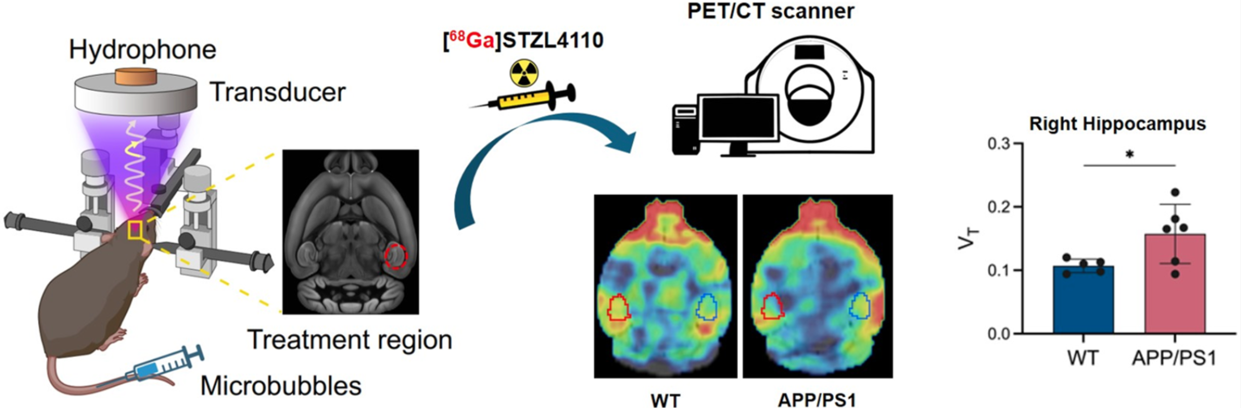 近日,上海科技大学生物医学工程学院程冰冰课题组联合罗宗化课题组在ACS Chemical Neuroscience 发表题为“Enhanced Positron Emission Tomography Imaging of β-Amyloid through Focused Ultrasound-Mediated Gallium-68 Radiotracer Delivery across the Blood-Brain Barrier” 的研究论文。联合团队利用聚焦超声(FUS)技术,突破血脑屏障的限制,显著提升了Ga-68放射性示踪剂在阿尔茨海默症(AD)模型小鼠脑的递送效率,从而增强了β-淀粉样蛋白的正电子发射断层扫描(PET)成像分析(见图1)。