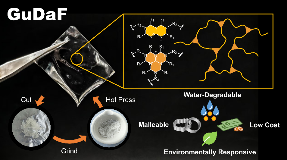 针对全球塑料污染难题,严佳骏课题组开发了一类基于曼尼希反应的新型可降解聚合物网络(GuDAF)。该材料利用低成本原料,在温和条件下构建了动态聚合物网络,其兼具传统塑料的力学性能和独特的可降解特性,为可持续材料设计提供了新思路。物质学院博士后黄红露为论文第一作者,物质学院严佳骏教授为通讯作者。